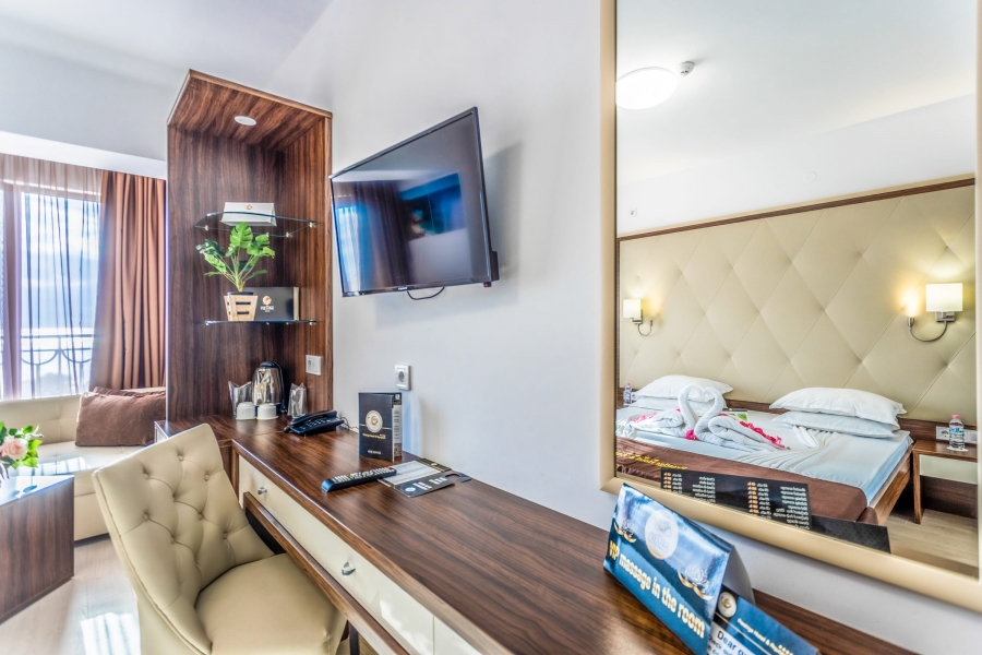 Gemütliche und komfortable, moderne, helle Zimmer, die sich hervorragend für Familien mit Kindern oder Paare eignen. Sie bestehen aus einem geräumigen Zimmer, Badezimmer mit WC und Balkon. Das Zimmer ist mit zentraler Klimaanlage, Safe, Mini-Kühlschrank, Wasserkocher, Internet, TV mit Satellitenkanälen, Dusche und/oder Badewanne im Badezimmer, Haartrockner und Toilettenartikeln ausgestattet. Das Zimmer verfügt über einen Balkon mit Gartenmöbeln, die zum Entspannen geeignet sind.